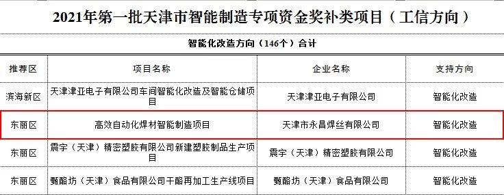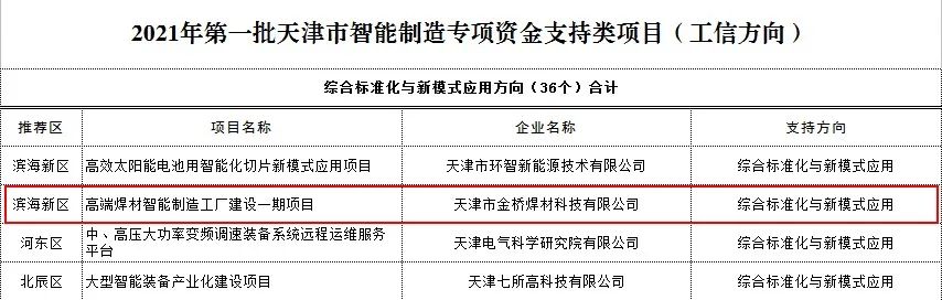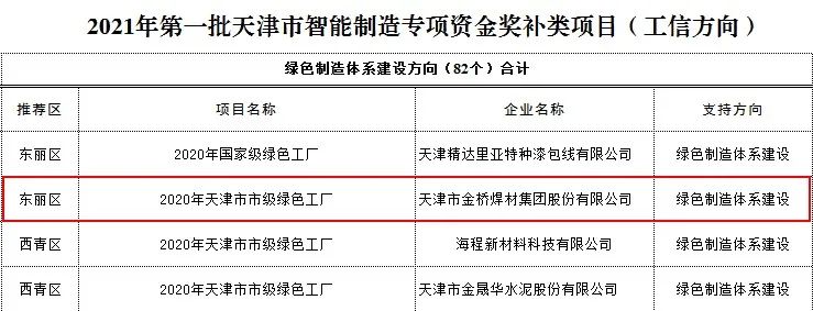 近日,天津市工信局公布《2021年第一批天津市智能制造專項資金項目公示》。金橋焊材集團《高端焊材智能制造工廠建設(shè)一期項目》、《高效自動化焊材智能制造項目》、《2020年度創(chuàng)建國家級綠色工廠》三個項目入選。