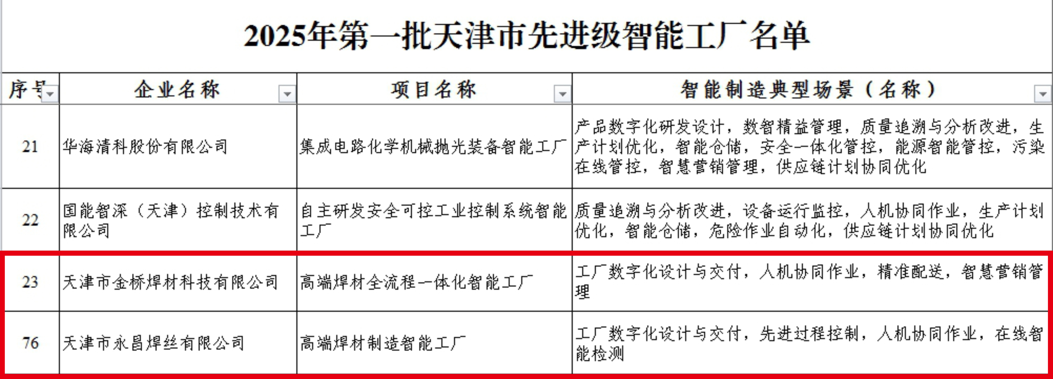 金橋科技公司、永昌焊絲雙雙斬獲天津市首批“先進(jìn)級(jí)智能工廠”認(rèn)證